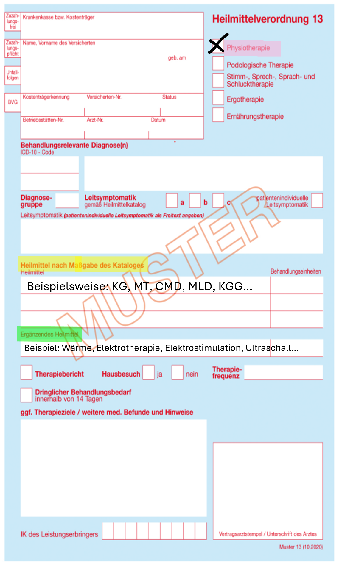 -Heilmittel: KG (Krankengymnastik), MT (manuelle Therapie), KGG (Krankengymnastik am Gerät), MDL (manuelle Lymphdrainage), CMD (craniomandibuläre Dysfunktion, häufig von Zahnärzt*innen verschrieben)